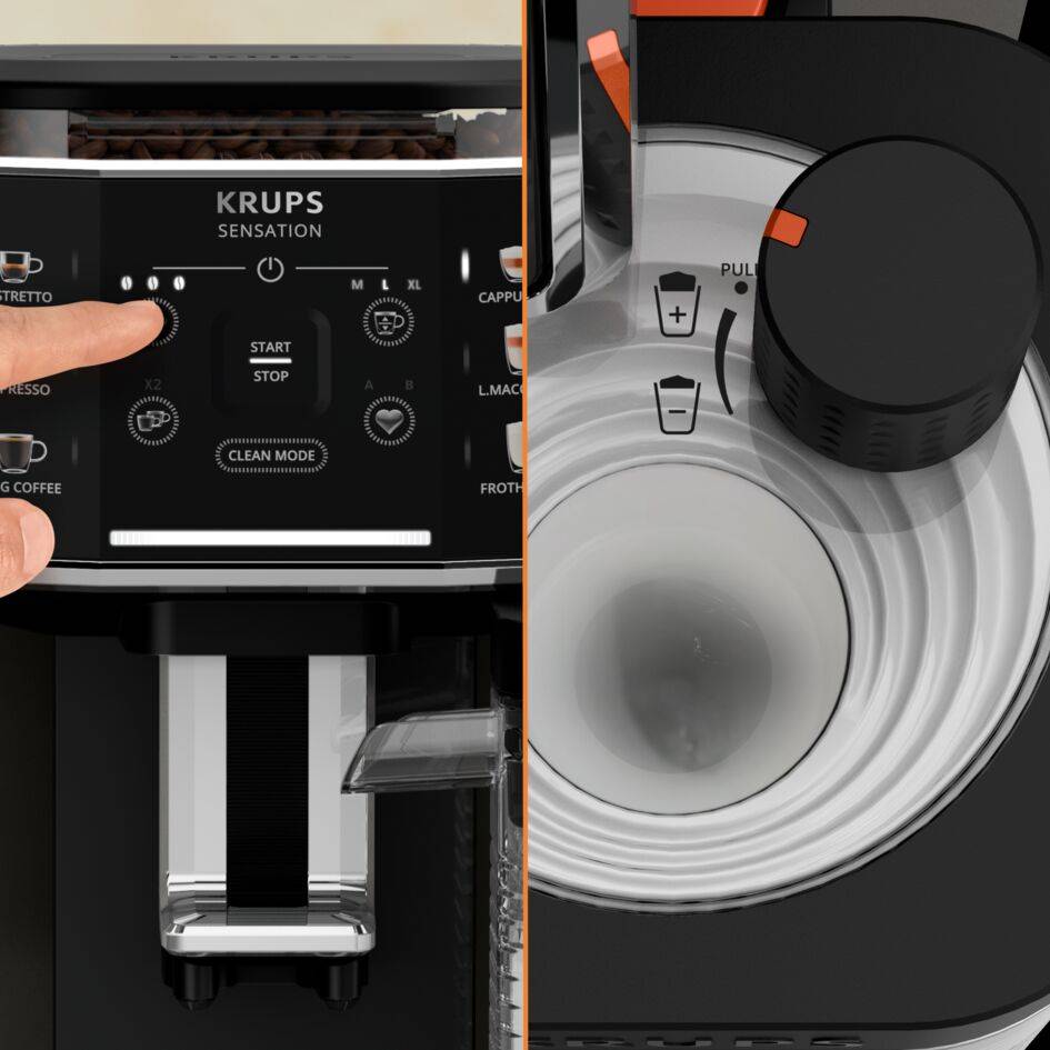 Genießen Sie für jede Art von Kaffeegetränk die richtige Tasse. Sie müssen sich nicht mehr zwischen kleinen oder großen Tassen entscheiden. KRUPS Sensation Milk bietet die Flexibilität, jede Tassengröße zu verwenden, von der kleinen Espressotasse bis zum großen Latte Macchiato-Becher.