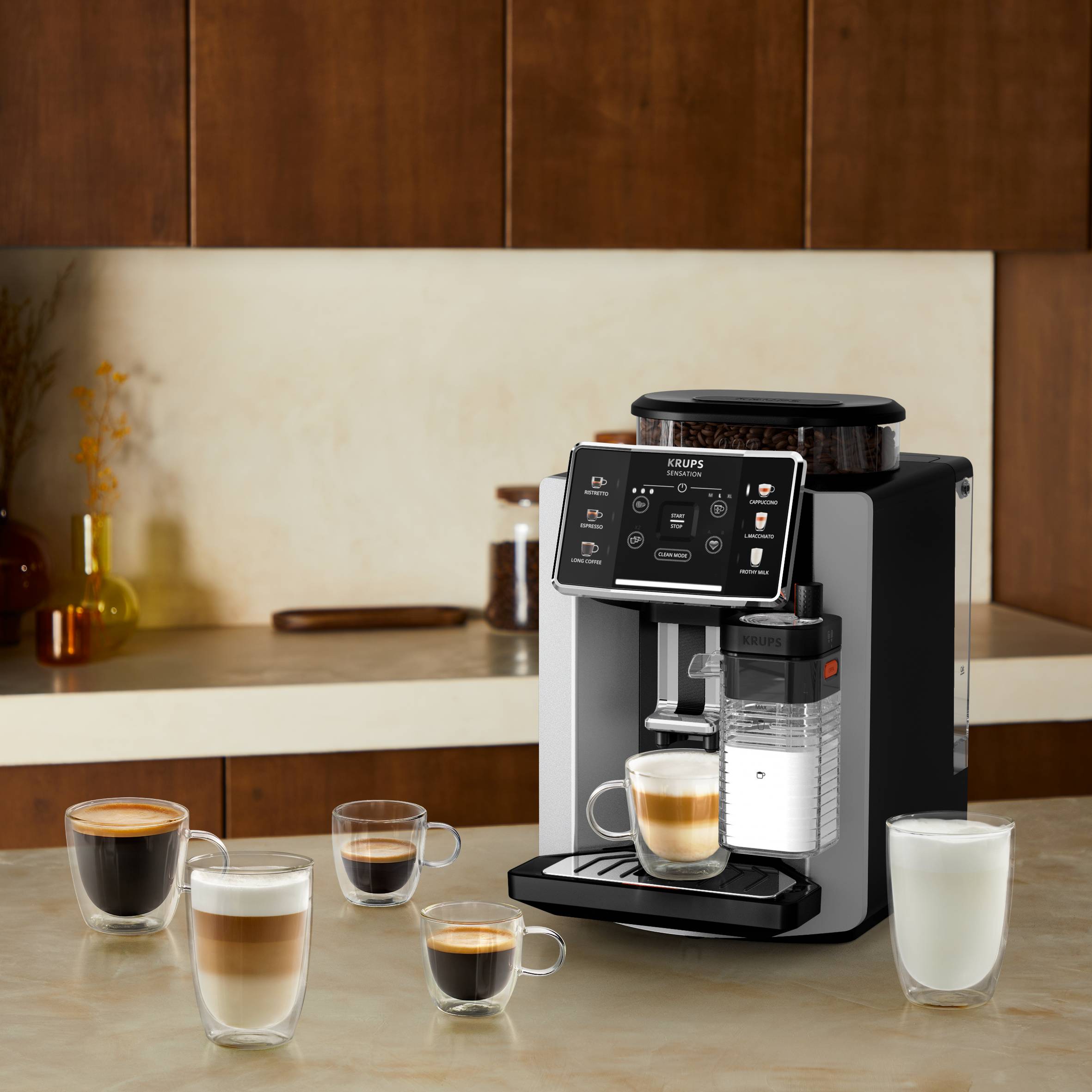 Genießen Sie exquisite Latte Macchiato und Cappuccini ganz unkompliziert. Der Kaffeevollautomat Sensation Milk von KRUPS sorgt für 6 köstliche Getränke aus frisch gemahlenen Kaffeebohnen, die dank der exklusiven Milk Maestro Technologie mit einem perfekt cremigen Milchschaum abgerundet werden. Genießen Sie individuelle Kaffees und Milchspezialitäten in Barista-Qualität, und das alles in einem leicht zu reinigenden, pflegeleichten Design, das nahtlos in jeden Raum passt.